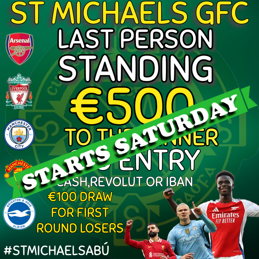 Only a few days remain before the last person standing competition begins … if you haven’t entered yet, you can Revolut Mossy and WhatsApp your selections before Friday . This is a great fundraising opportunity ahead of our 4g development #stmichaelsabú 🟢🟡