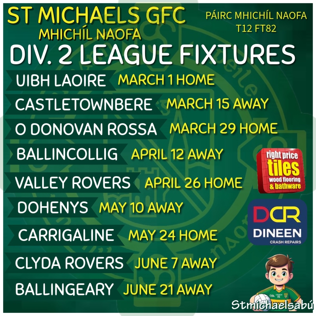 Our Senior league fixtures are out. We have a few trips to make , most notably away to Castletownbere on the 15 March. Nevertheless, we will have a good build up to Championship in late July. #Stmichaelsabú 🟢🟡