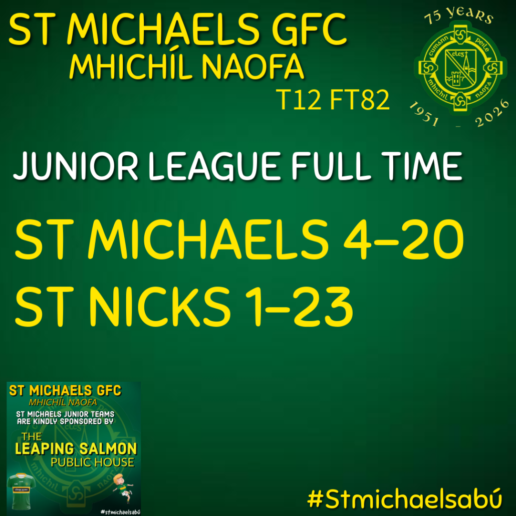 A great win for our Juniors tonight in Páirc Mhichíl Naofa. A high scoring entertaining match played in splendid sunshine. #Stmichaelsabú 🟢🟡