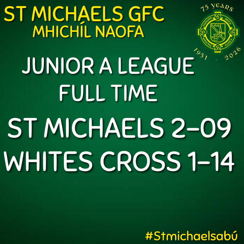 Our Junior A team put in a very gutsy and determined performance this afternoon in Páirc Mhichíl Naofa against a very experienced Whites Cross outfit. With a lot of players just out of Minor , mixed in with a few experienced campaigners , the result was a bit harsh, and at the end could have gone either way indeed. Playing with a breeze in the opening 30, we played a lovely brand of attacking football and were unlucky not to have been further ahead at half time. Adam Hennessy opened the scoring early from a free he earned himself ,and quickly added another from play, before Whites Cross added their first point. Henno again, with a free, and another from play, quickly edged us 4 to 2 ahead, and after Whites Cross got back to within a point, a quick break upfield involving Paddy Quill and Henno, resulted in Cillian Murphy raising a green flag. The second half was always going to be about us dogging it out, and Whites Cross quickly established a foothold in the early part of the half with a goal, which was quickly followed by a brace of two pointers to establish a five point lead. 3 Liam Sullivan frees on the bounce brought us back into contention however, and when Paddy Quill added one from play, it was game on. Whites Cross had other ideas, and when they added a point from play and another from a free, they moved back into a 4 point lead. Paddy Quill again rounded off a great team move with a fabulous score to leave 3 in it , before David Hogan raised our second green flag to draw level with 2 mins on the clock. With time nearly up, we had a great opportunity for goal, but the Whites Cross keeper stood firm and when the ball worked its way downfield, an indiscretion led to us falling behind again, and following the kick out, another free was converted to leave us on the wrong side of a 1-14 2-09 score line. A load of positives, with some lads making their debuts , more to come from these lads. Well done to all involved on such a positive performance.