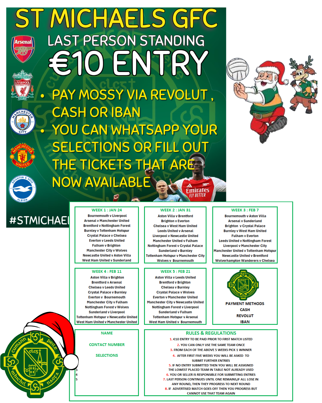 Tickets now on sale. Contact Mossy. Pay via Revolut Cash or IBAN. You can also WhatsApp your selections to Mossy.