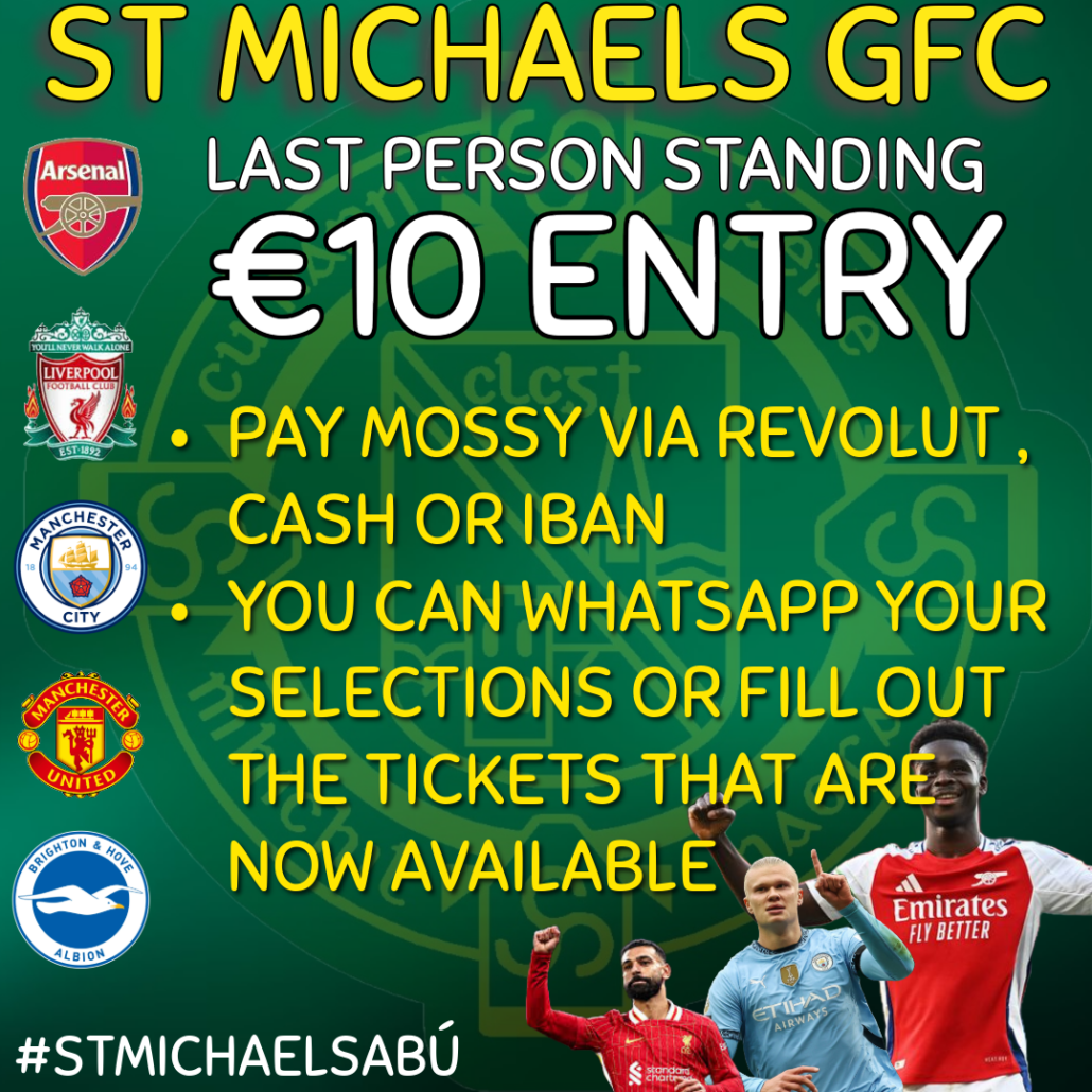 Only a few weeks before Last Person Standing begins. After last night , and Wolves dropping the points at OT , there could have been a lot of first round losers if it started yesterday 😉😉 get your ticket now #stmichaelsabú 🟢🟡