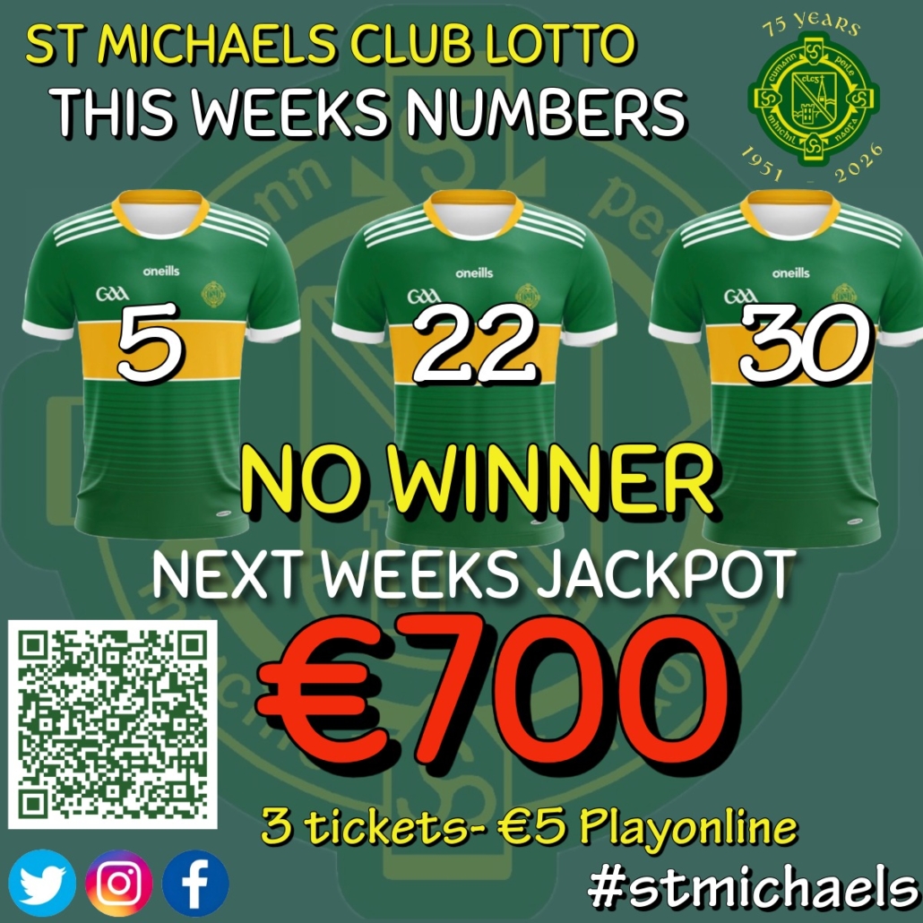 There was no winner of our club lotto draw tonight. The Jackpot is now €700 click on the below link and get your tickets now. https://stmichaelsgfc.clubforce.com/products/lotto/st-michael-s-gaelic-football-club