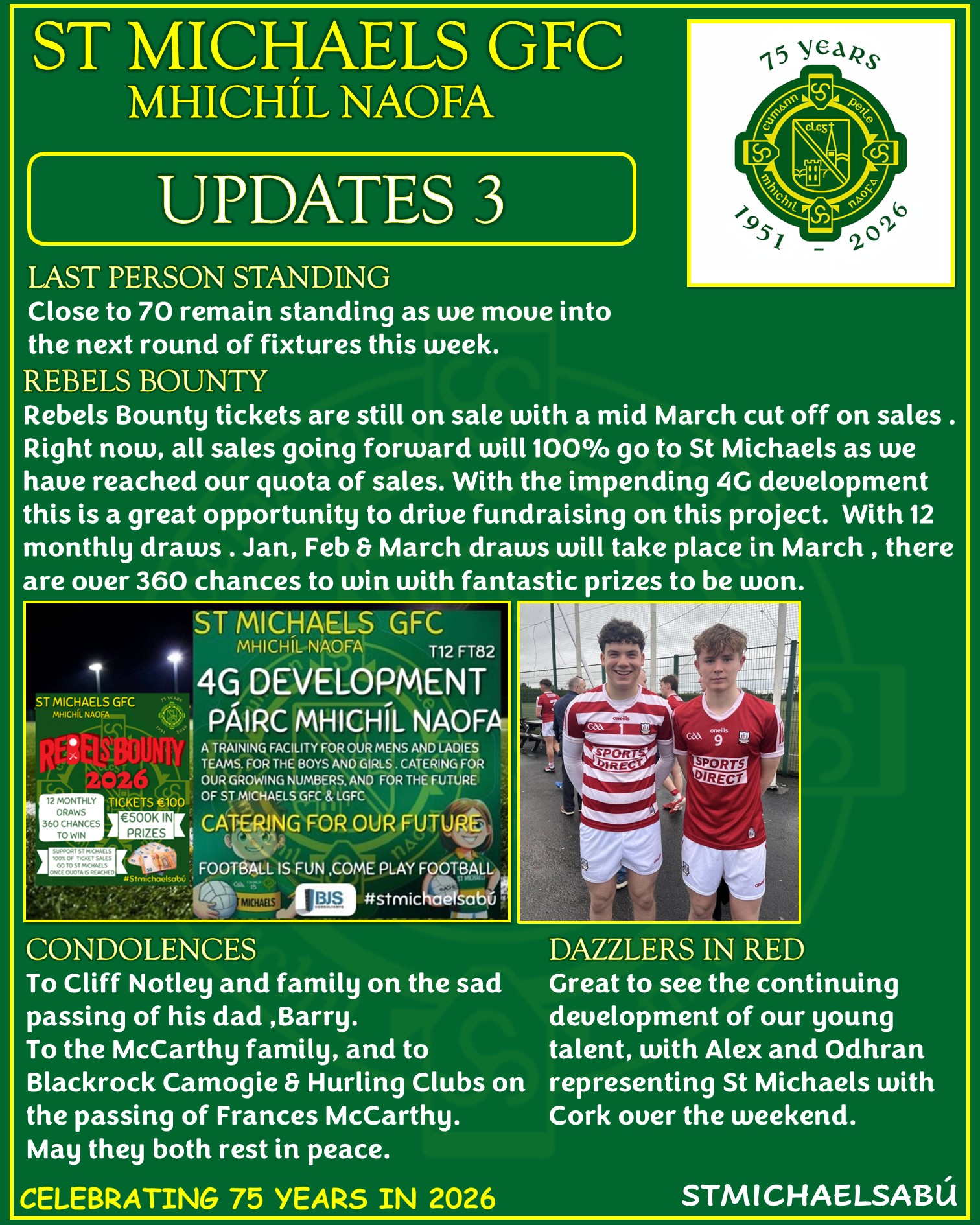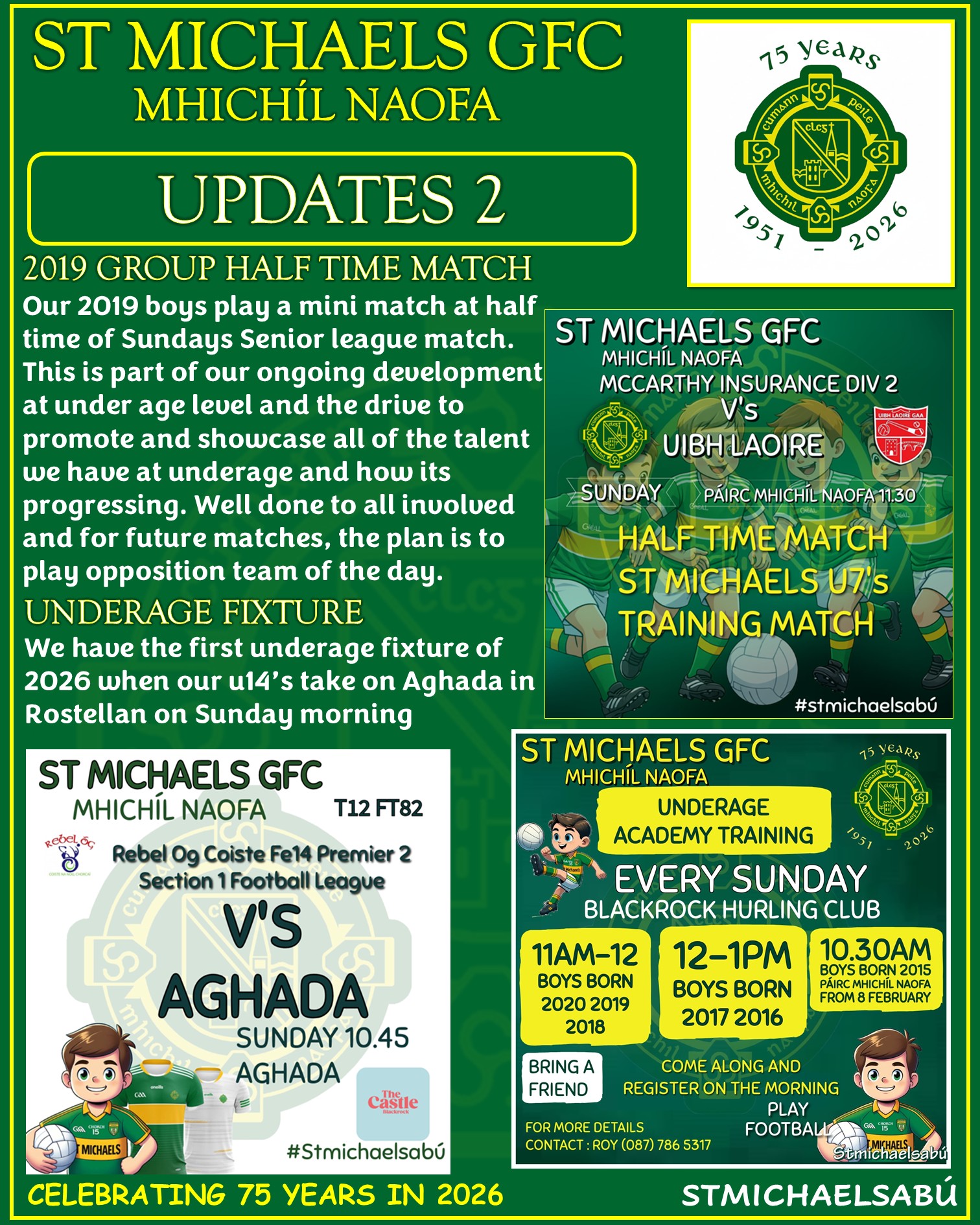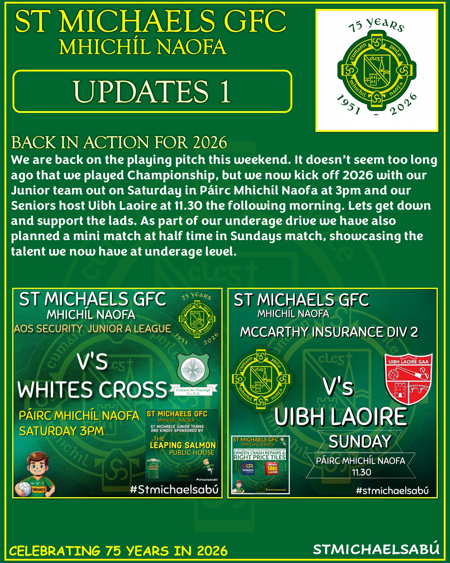 Some updates from St Michaels as we kick off 2026 this weekend coming across Senior Junior and U14. Hope to see a big crowd in Páirc Mhichíl Naofa this weekend.